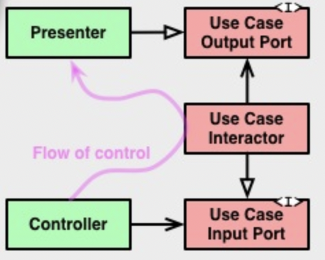 해당 다이어그램의 분홍선을 보게되면 UseCase가 Presenter를 호출을 할 수도 있는데